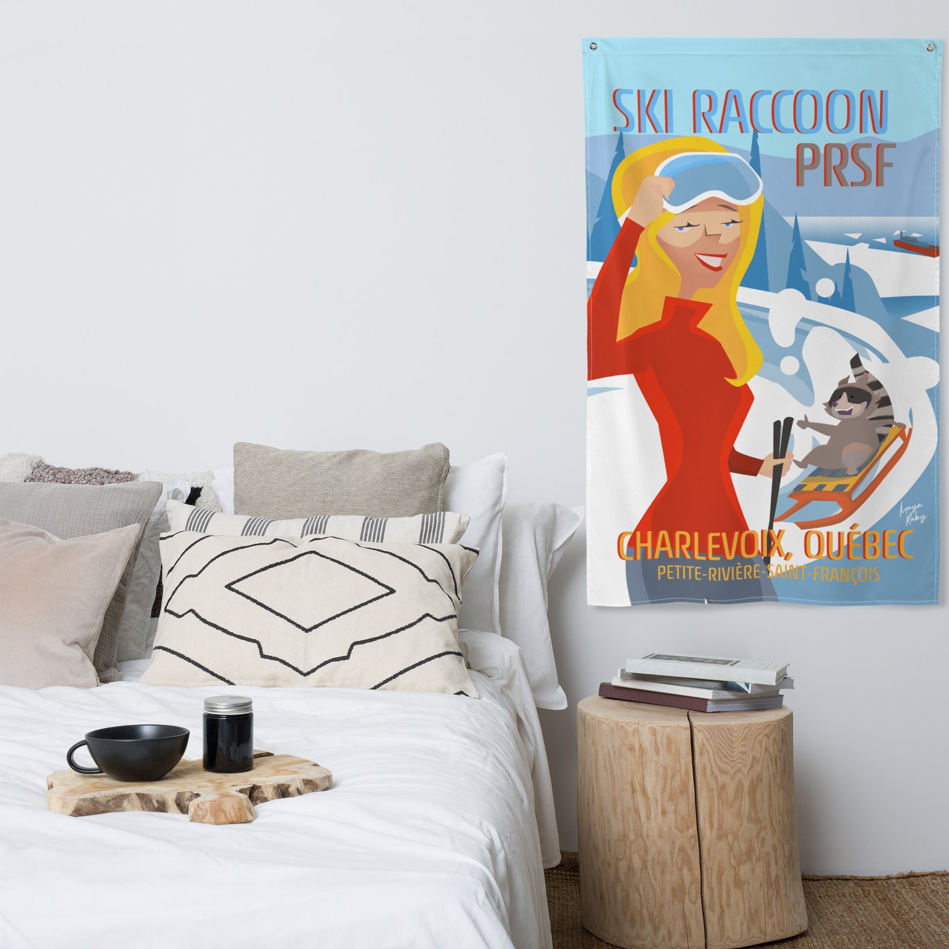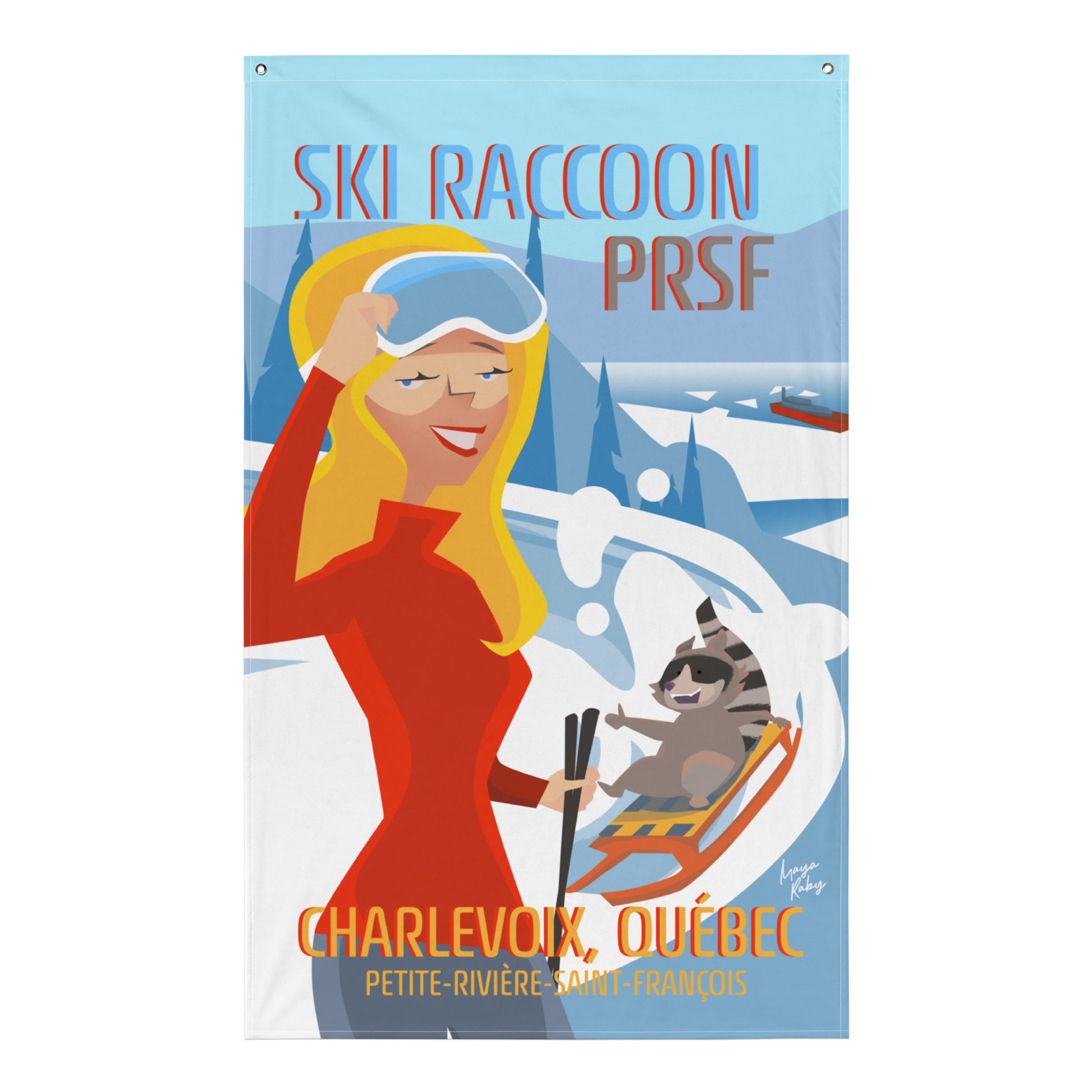 Plongez dans le Ski Raccoon de Charlevoix. Représentation ludique du ski et de la luge à Petite-Rivière-Saint-François qui égaiera n'importe quel espace et apportera à coup sûr un brin de folie en ajoutant ce drapeau unique à votre mur. Votre drapeau en polyester ne se froissera ou ne se rétrécira pas et il est fait pour durer.